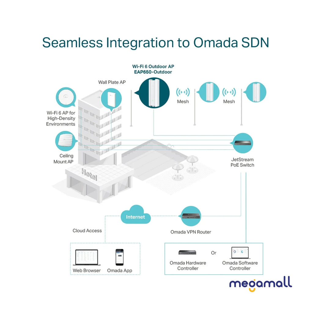 • Omada Mesh Technology: Enables wireless connectivity between access points for extended range and flexible deployment.3