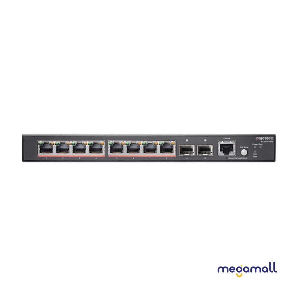 ECS2100-10PE is a Web Smart Pro Switch, it supports 8 x GE PoE+ ports + 2 GE SFP uplink ports with 1 RJ45 Console port and Fanless design. The PoE Budget is max.65W.