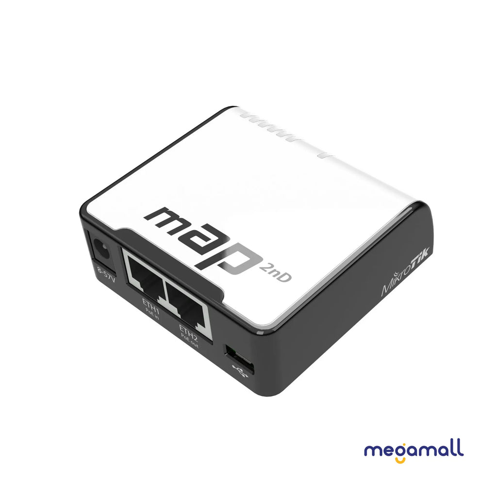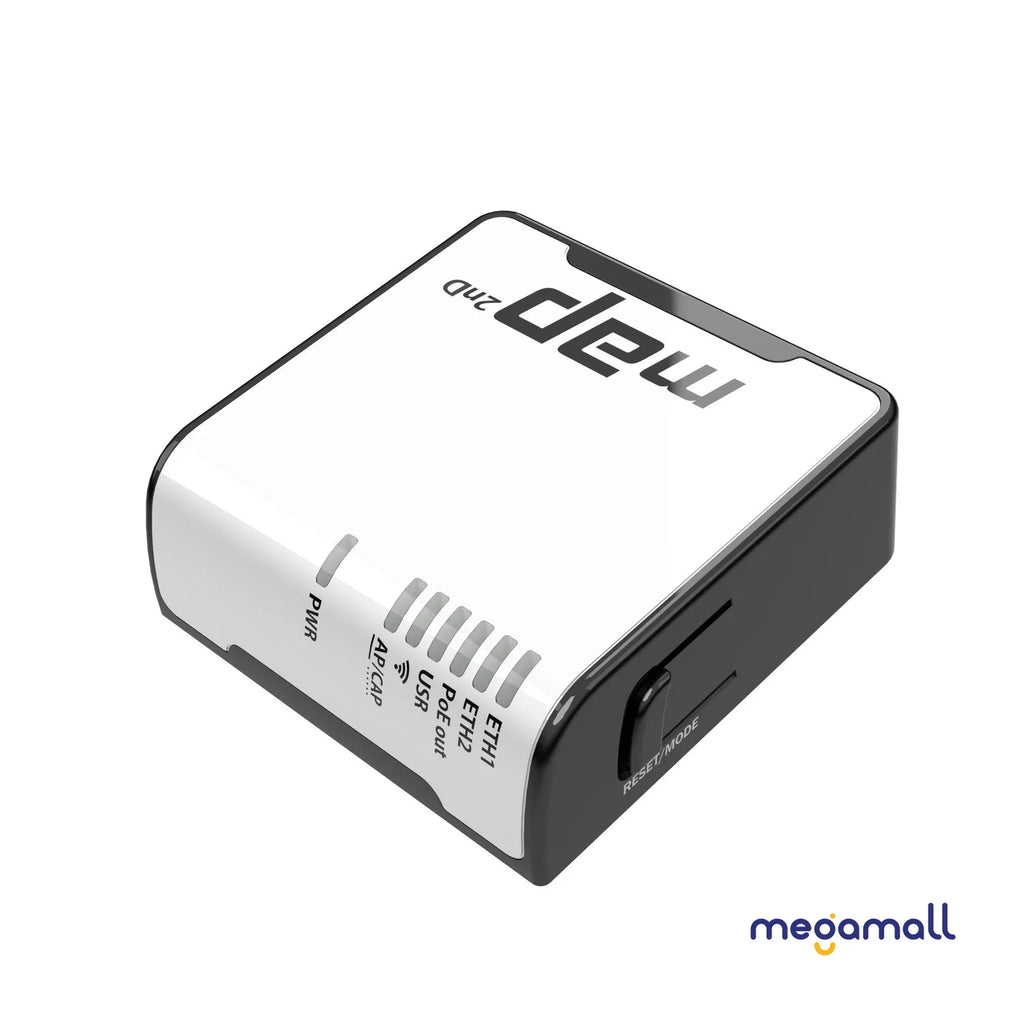 The mAP (micro Access Point) is a tiny size wireless Dual-Chain 2.4GHz Access Point with full RouterOS capabilities. It is very portable, since it accepts power from a wide variety of sources - USB, Passive PoE and power jack. It also works as a PoE injector - the second Ethernet port provides up to 500mA of power to another device, for example, you can connect a SXT CPE device to it.