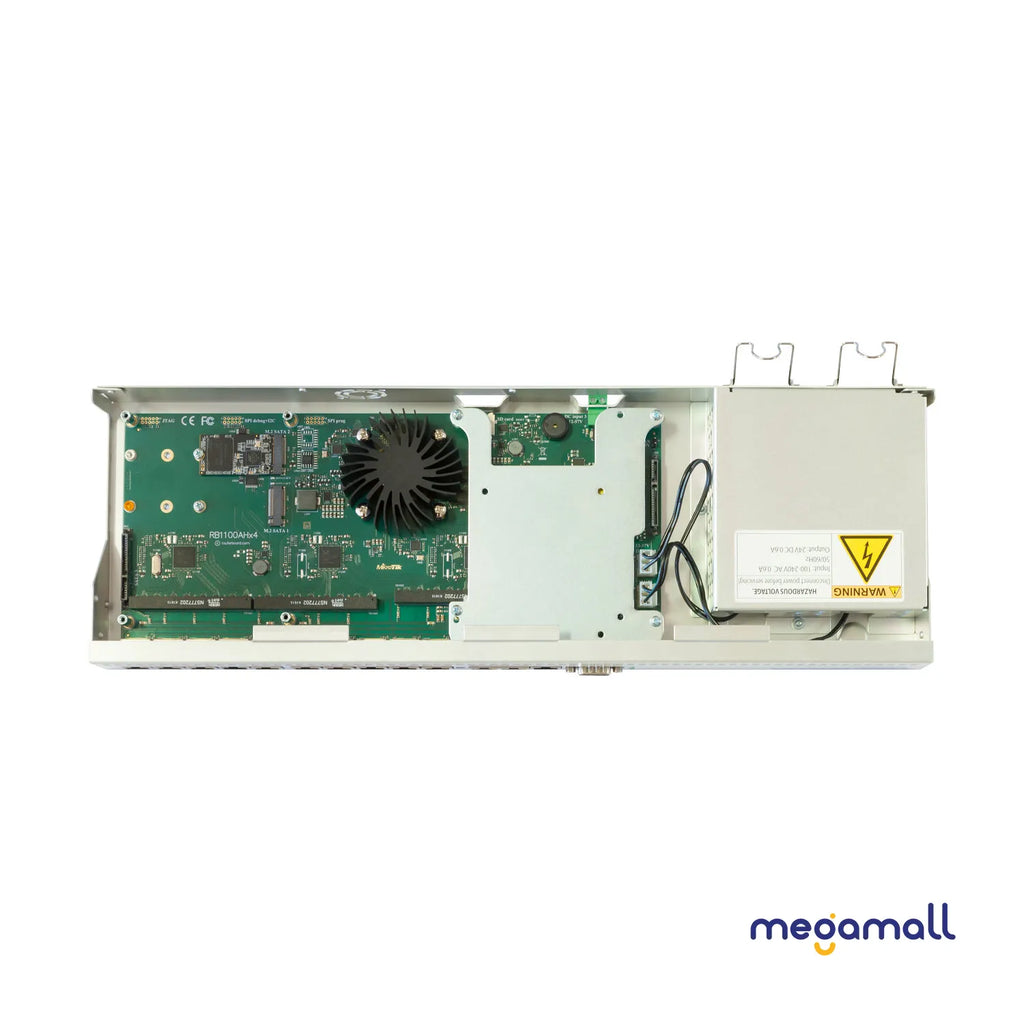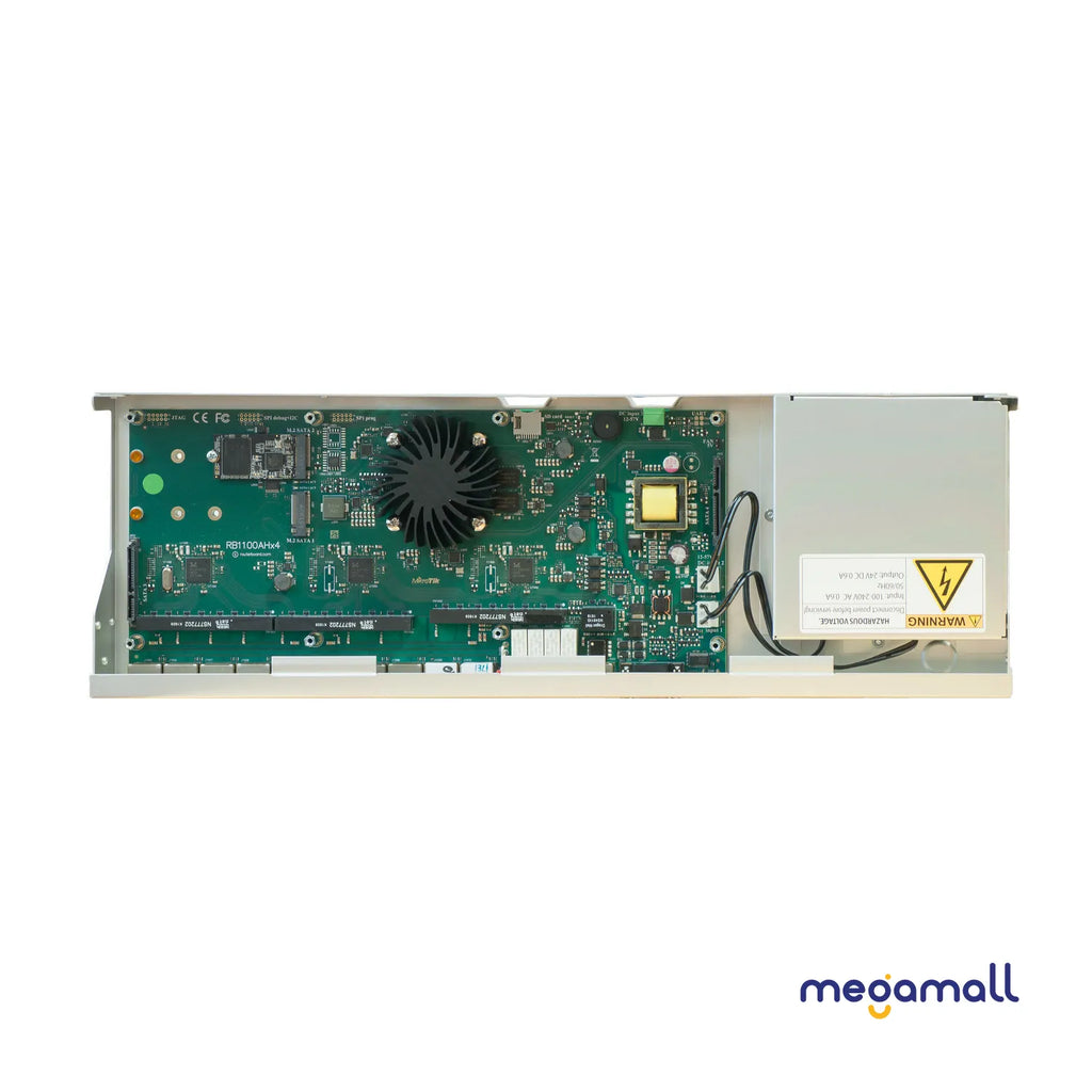 Unit comes with 1U rackmount case, 13x Gigabit Ethernet ports, RS232 serial port and dual redundant power supplies (with -48v DC telecom power and 802.3at/af support). The RB1100AHx4 Dude edition features several high speed storage connectors (two SATA and two M.2) for using a Dude database, proxy cache or any other storage intensive feature. It includes a 60GB M.2 drive already installed.