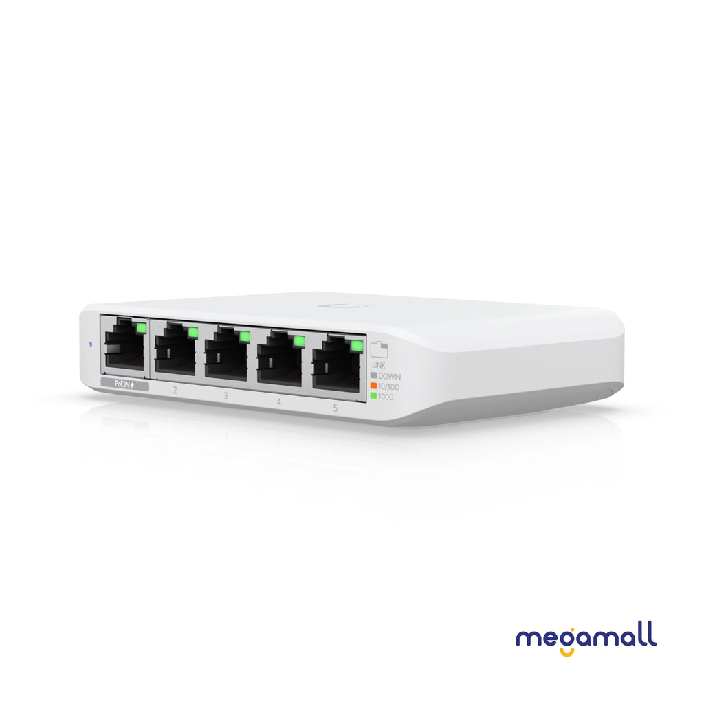 A compact, 5-port, Layer 2 switch that can be powered with PoE or a 5V USB-C adapter.